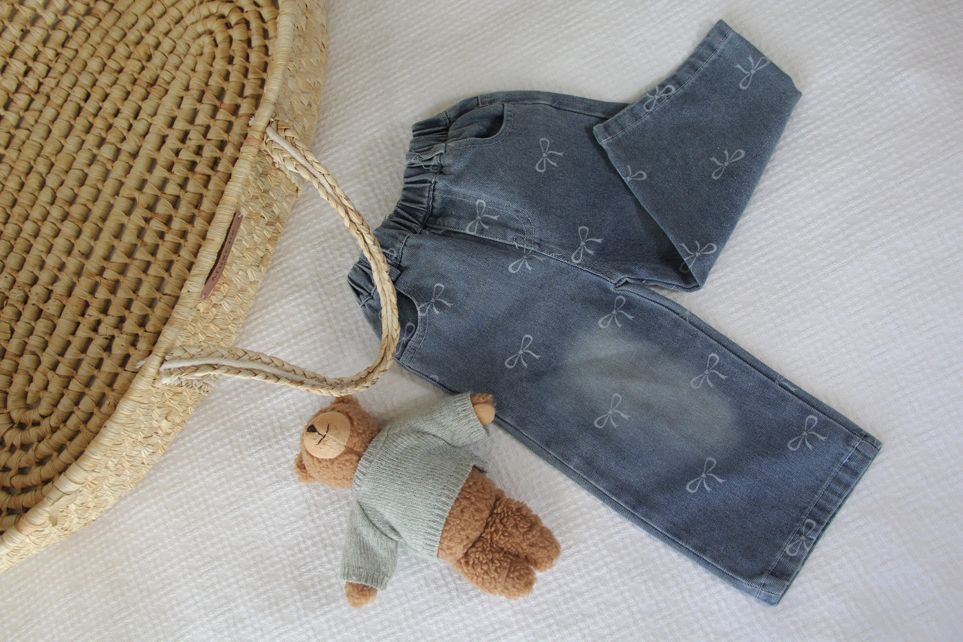 These are the jeans currently breaking the internet: perfectly washed vintage-blue scattered with the sweetest tiny bow print, a relaxed wide-leg silhouette that looks straight off a Parisian toddler, and an ultra-soft elastic waist that makes dressing (and diaper changes) a dream. The exact pants that get you stopped everywhere and make every photo look like a magazine cover.